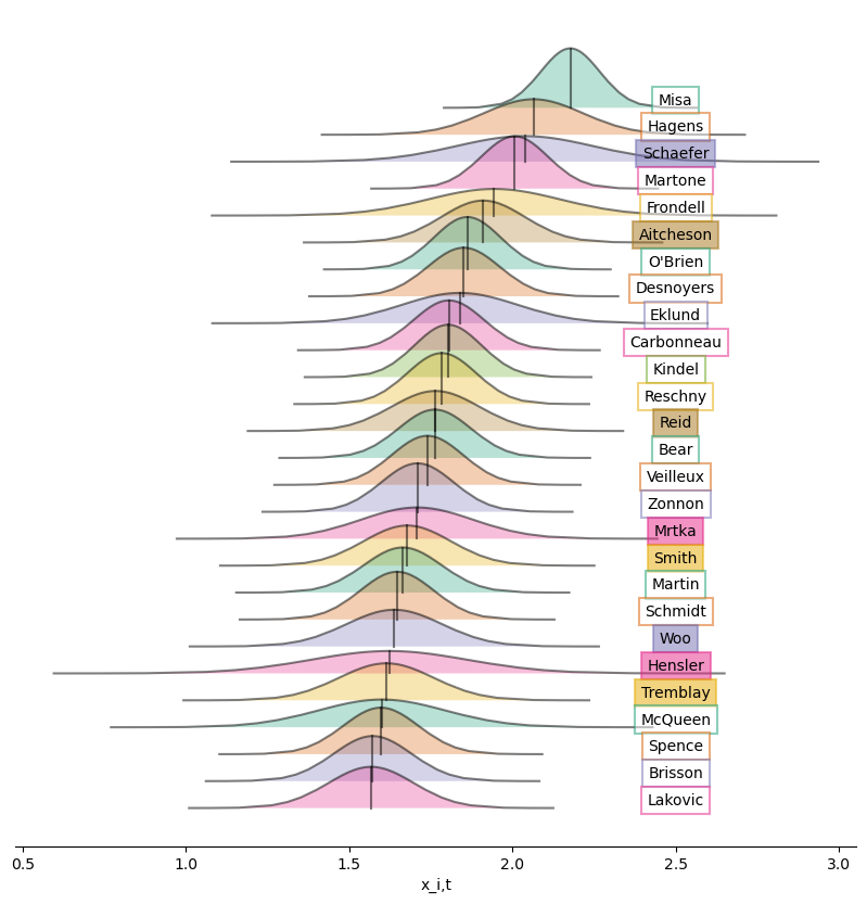 Ridge plot ordering the top 27 eligible players for the 2025 NHL Draft based on the posteriors for player ability \(x_{i,t}\). In list form below.